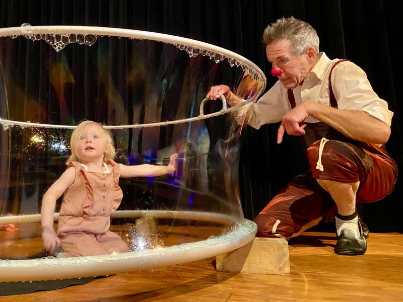 Natuurlijk mogen kinderen meehelpen: met muziek maken of in een levensgrote zeepbel zitten. Hoe kan het toch, zo heb je een bezemsteel en zo is het een levende pop die verliefd wordt op je moeder. O ja, accordeon speel je met het puntje van de tong.