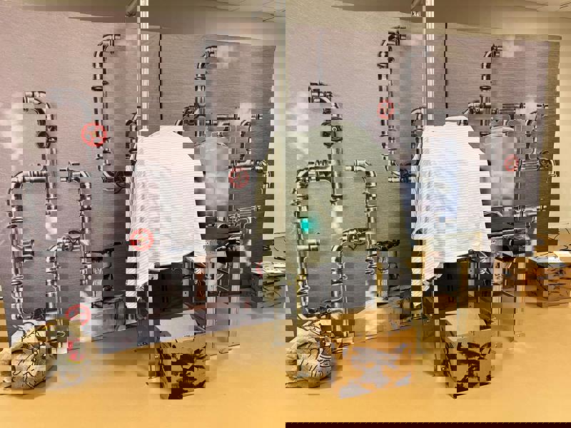 Speelvlak: Het grote decor neemt een ruimte in belsag van minimaal 6 bij 4 meter.