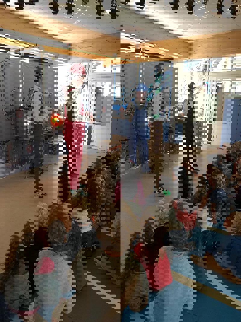 Het is een interactieve en komische kindervoorstelling met geluidseffecten en een uitgebreid decor. Alsof je echt naar het theater gaat met de leerlingen, maar dan op school!